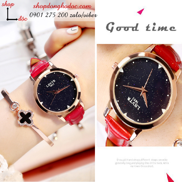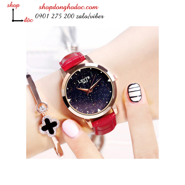 Đồng hồ nữ dây da mặt tròn cao cấp dây đỏ sang chảnh ĐHĐ2101 với thiết kế độc đáo Mặt đồng hồ như bầu trời khuya ngập tràn ánh sao đang được các tín đồ thời trang truy lùng ráo riết.