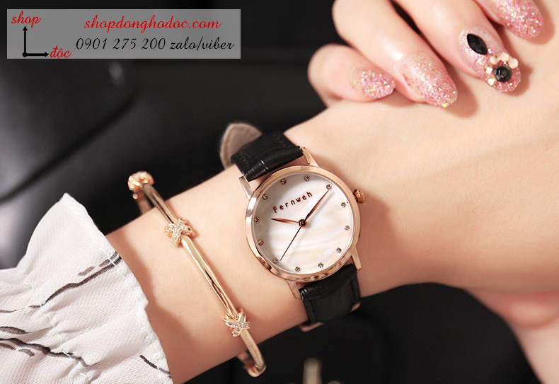 - Tên: Đồng hồ nữ dây da mặt tròn đen cá tính Fernweh ĐHĐ6405