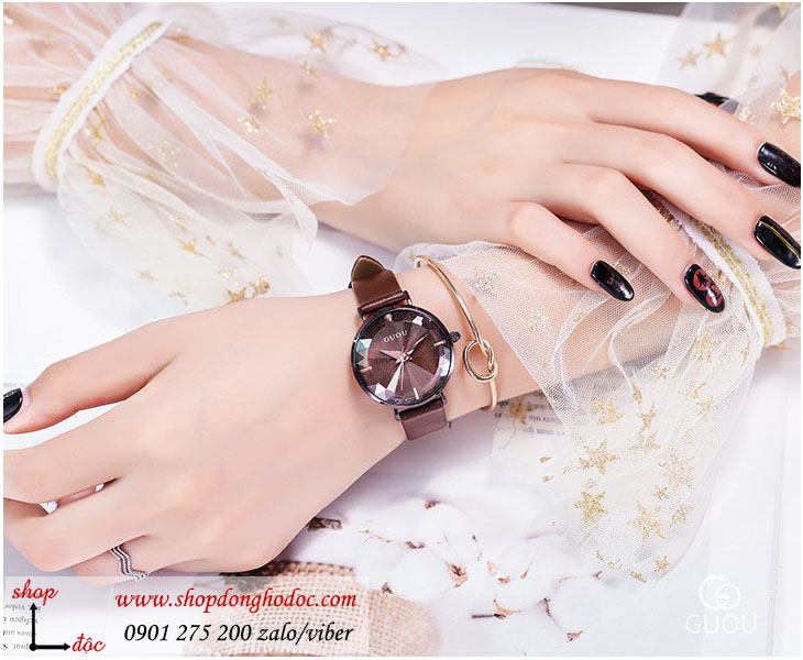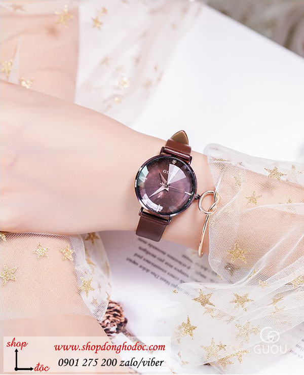 - Tên: Đồng hồ nữ dây da mặt tròn màu nâu đất trầm ấm Guou ĐHĐ9801